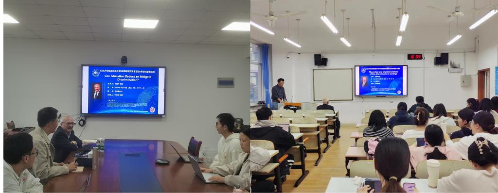 为庆祝yl12311线路检测在威海校区办学40周年,10月15日下午、18日下午,国际知名劳动经济学者、美国西密歇根大学经济系教授、Timothy Light Center中国研究中心主任黄维乔做客yl12311线路检测学术论坛,在北衡楼424、图西环214分别为yl12311线路检测师生带来题为“Can Education Reduce or Mitigate Discrimination?”、“Theoretical and empirical analysis of the determinants of earnings”的学术报告。论坛由yl12311线路检测宁光杰教授主持,相关专业师生参加本次论坛。