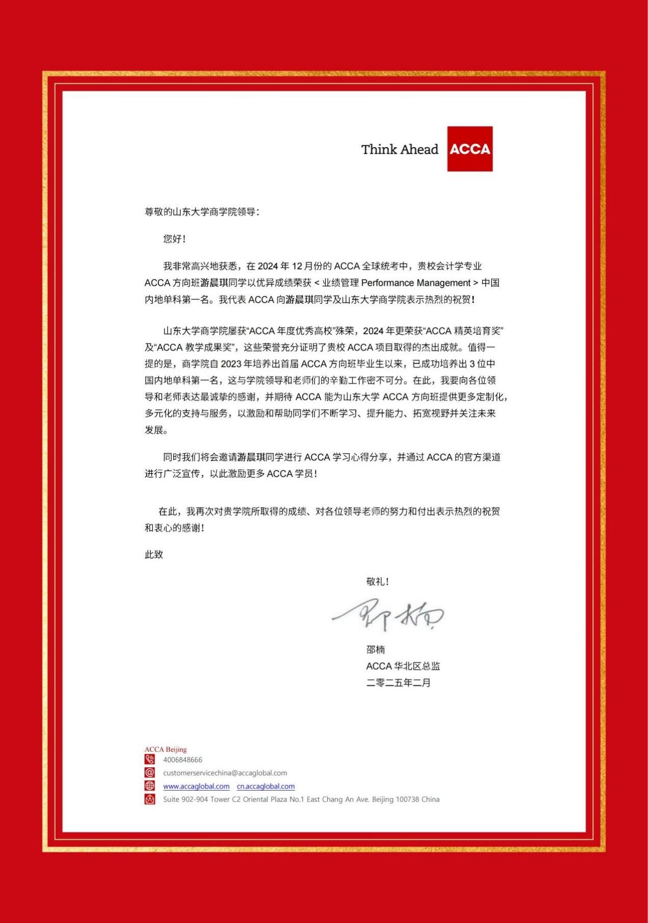 ACCA华北区总监邵楠又双叒叕发来贺信,向yl12311线路检测及游晨琪同学致以热烈的祝贺!