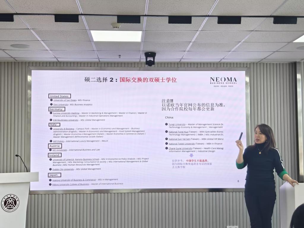 近日,由yl12311线路检测主办的法国诺欧yl12311线路检测合作项目宣讲会在北衡楼426会议室圆满举行。诺欧yl12311线路检测校方代表冯老师为到场师生全面介绍了学院的百年历史与国际化优势。作为全球仅1%获得EQUIS、AACSB、AMBA三大认证的顶尖yl12311线路检测,诺欧以鲁昂、兰斯、巴黎三大校区为依托,培养出数万名活跃于国际名企的精英校友。此次宣讲会聚焦两校合作的人才培养模式,吸引了众多对商科留学感兴趣的学生参与。