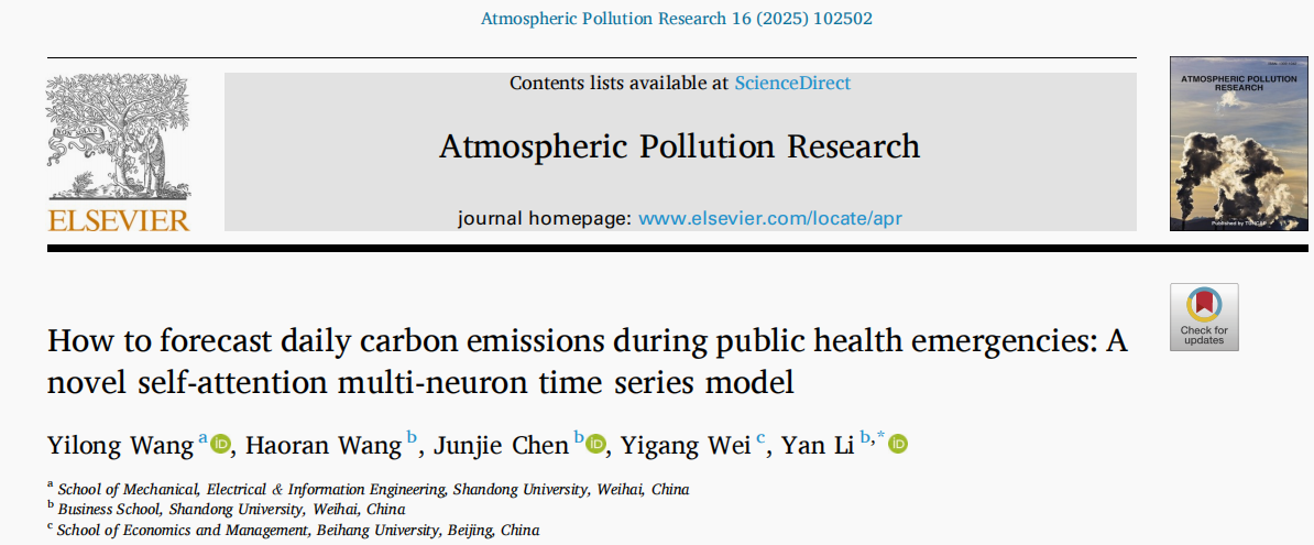 近日,yl12311线路检测李燕教授指导机电与信息工程学院本科生王怡龙和yl12311线路检测本科生王浩冉,在国际知名期刊《Atmospheric Pollution Research》上发表了题为《How to forecast daily carbon emissions during public health emergencies: A novel self-attention multi-neuron time series model》的研究论文。该研究提出了一种新型自注意力多神经元时间序列(SAMNTS)模型,用于预测公共卫生紧急事件期间的每日碳排放量,为应对全球气候变化和公共卫生危机提供了新的科学依据。