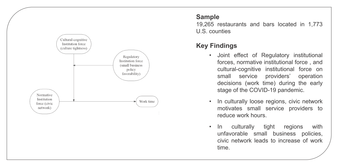 研究聚焦COVID-19疫情早期美国1773个县中19,000余家小型服务业门店的运营行为,揭示在生命威胁情境中,小企业的社会行为不仅取决于经营本身,更受到三类制度性力量的深刻影响:政府政策、社区规范与文化认知。在文化宽松的地区,若社区拥有活跃的公民网络(即居民间高度互助的组织关系),小企业更倾向于减少营业时间,以响应社区健康需求;而在紧文化区域,即社会规范强烈、对偏离行为容忍度低的环境下,哪怕同样具备强公民网络,小企业也更可能维持原有运营,难以快速适应公共危机。值得注意的是,若当地已有较完善的小企业支持政策,这类文化紧张的“惯性”则可能被打破,激发企业更积极的调整行为。这些结论表明:制度环境并非单一力量,而是多元制度因素共同作用的复杂网络,对小企业的行为有极强的“地方性”影响。