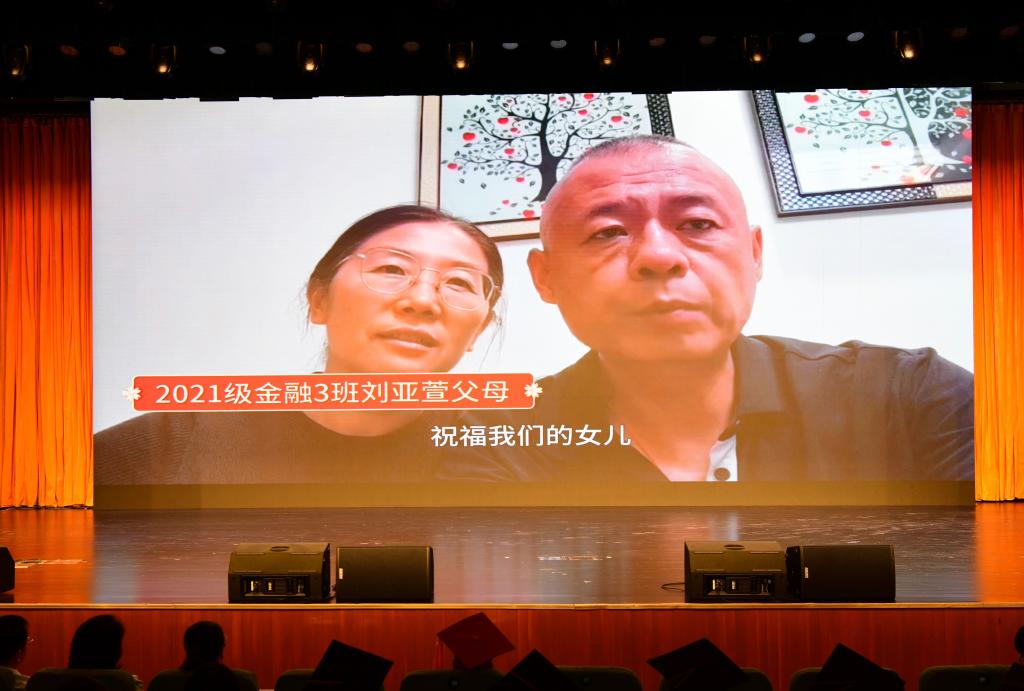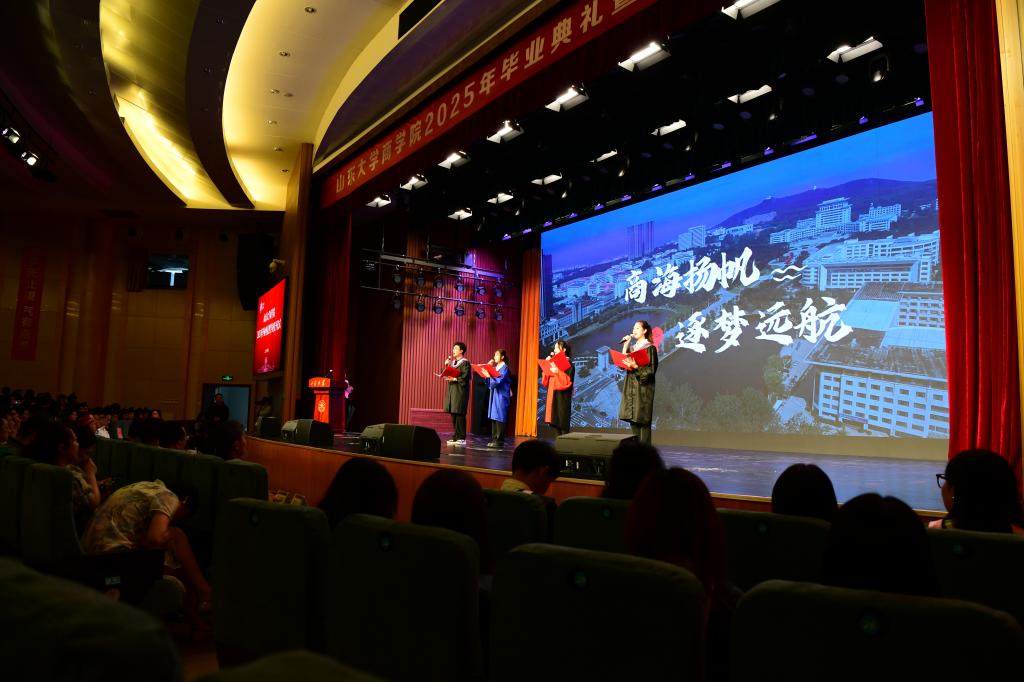 “谁言寸草心,报得三春晖。”典礼现场播放了毕业生家长祝福视频,浓浓亲情浸润全场。2022级应用经济学博士生沈春蕾、2022级会计学专业硕士生王一诺、2021级金融学专业本科生左珈、2021级人力专业本科生严粢业同学合诵毕业献词《商海扬帆,逐梦远航》,献上对母校的告白。从本科生课堂的“微观经济学书页间的晨光”,到硕士“企业调研的田野实践”,再到博士“导师朱笔批阅的学术探索”,展现不同学历阶段的成长印记,将典礼推向高潮。