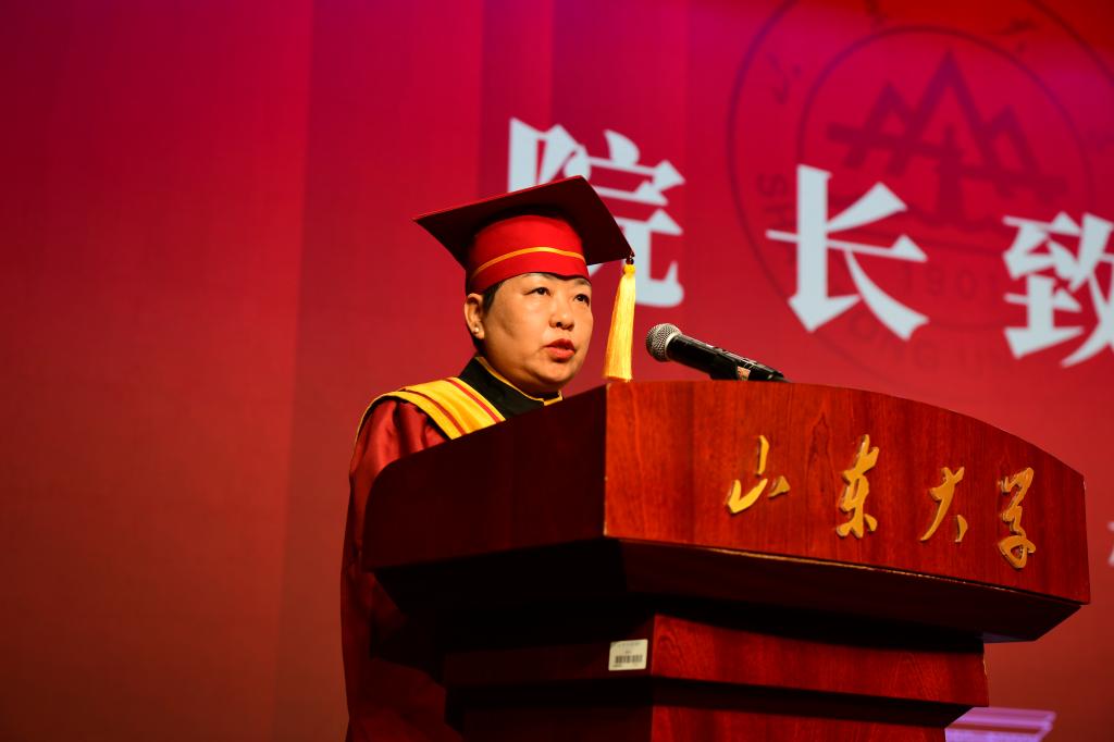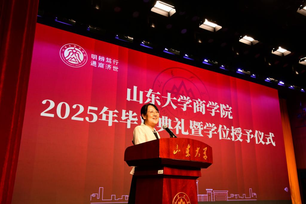 在院长致辞中,杨林深情回顾了同学们在校期间的奋斗与成长,对同学们在校期间取得的优异成绩给予了充分肯定。面向即将踏上新征程的毕业生,她提出了三点殷切期望:一要成为时代的“瞭望者”与“担当者”,在恢宏图景中精准锚定生命坐标;二要成为时代的“实干家”与“破题者”,在浩瀚长河中精美擘画人生轨迹;三要成为时代的“含光者”与“感恩者”,在从容淡定中精心勾勒成长矩阵。最后,她深情表达了母校与学院对同学们的牵挂与祝福,期待毕业生们带着山大人的格局与商学人的智慧,在强国建设的宏伟蓝图中展现商学力量,在时代浪潮中书写青春华章。