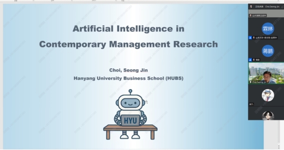 开学典礼结束后,暑期学校第一课正式开讲,由来自汉阳大学的崔成镇(Choi, Seong-jin)教授为同学们带来“Artificial Intelligence in Contemporary Management Research”为主题的报告。崔教授以其丰富的学术经验和前沿的研究成果,深入浅出地介绍了人工智能在当代管理研究中的应用,通过生动的案例讲解与分析,展示了人工智能如何影响当代管理学研究范式。互动环节,Choi教授与师生围绕AI赋能管理学研究的相关问题展开了深入交流,气氛活跃。暑期学校第一课使同学们对AI在管理领域的应用有了更加直观和深入的理解,为同学们打开了新的学术视野,为之后课程的举办作了良好的开端。