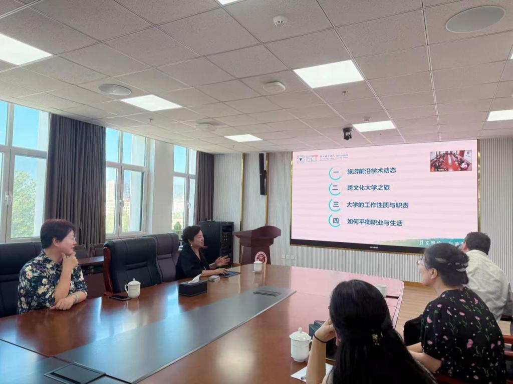 在报告环节,邱汉琴教授从旅游学术前沿动态、跨文化大学之旅、大学的工作性质与职责、如何平衡职业与生活四个方面展开讲解。邱教授首先对当前旅游领域内智慧旅游与数字化转型、可持续发展与生态旅游、健康与康养旅游、文旅深度融合以及跨境旅游与全球化管理等热点研究方向进行了深入剖析,并指出人工智能、大数据、虚拟现实等技术的应用正在深刻改变着旅游业的形态。回顾自己的学术生涯,从南开大学旅游本科专业的早期学子,到滑铁卢大学、思克莱德大学的深造与工作经历,再到香港理工大学与浙大城市学院的成就,邱教授在多元化的环境中不断学习、探索,积累了丰富的学术与管理经验。谈及大学教师的工作性质与职责,邱教授概括为“教学、科研、社会服务”三个关键词。她强调,系统性授课与参与教材编写是教学工作的基石;掌握研究动态、申报科研课题则是科研工作的核心;回馈社会、履行服务义务也是大学教师不可或缺的责任。最后,邱教授分享了她在平衡职业与生活方面的独到见解。她认为,不同职业阶段应有不同的侧重点,要在夯实教学与科研的基础之上不断向行政工作与学术研究方面寻求突破,同时她还强调了家庭支持、时间管理、第三方力量以及高效社交的重要性。
