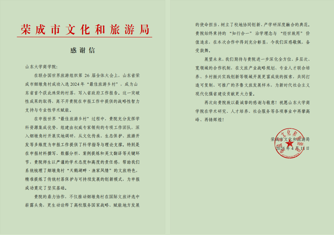 信中,荣成文旅局指出,在申报联合国旅游组织“最佳旅游乡村”的过程中,学院充分发挥学科资源集成优势,组建由权威专家领衔的专项工作团队,深入烟墩角村开展实地调研,从文化传承、生态保护、旅游开发等多维度为申报工作提供了科学指导与理论支撑。特别是在申报材料撰写、数据分析、案例提炼和英文翻译等关键环节,学院师生以严谨的学术态度和高度的责任感,帮助荣成市文化和旅游局系统梳理了烟墩角村“天鹅湖畔·渔家风情”的文旅特色,精准提炼了传统村落保护与可持续发展的创新模式,为申报成功奠定了坚实基础。
