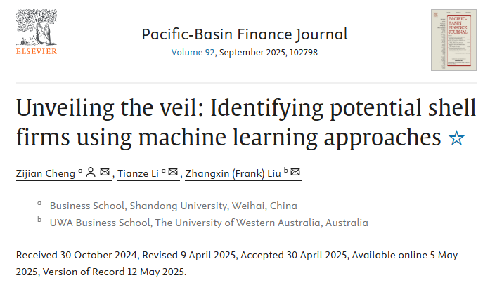 此外,程子健副教授团队近期成果Unveiling the veil: Identifying potential shell firms using machine learning approaches. 在线发表于国际期刊Pacific-Basin Finance Journal (SSCI Q1)。 该文章利用中国A股借壳上市数据构建机器学习算法,对潜在壳公司进行了预测。该研究进一步通过成本—收益视角,从分析师、投资者与监管层三个维度分析了算法的收益与潜在损失。本文为资本市场管理、IPO管控以及大数据金融领域的研究与实践提供了经验证据。程子健副教授为文本第一兼通讯作者,博士生李天泽为第二作者,西澳大学Zhangxin (Frank) Liu 为第三作者。yl12311线路检测为第一和通讯单位。