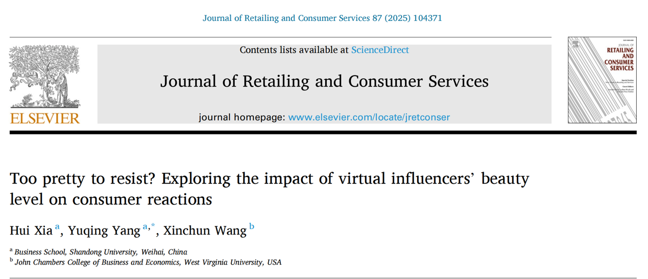 研究成果二:“Too pretty to resist? Exploring the impact of virtual influencers’ beauty level on consumer reactions” 发表SSCI期刊Journal of Retailing and Consumer ServicesJCR Q1IF=13.1中科院1TOP)。yl12311线路检测夏辉教授为第一作者,yl12311线路检测博士研究生杨雨晴为第二兼通讯作者,yl12311线路检测为第一和通讯作者单位。该论文是与美国西弗吉尼亚大学王新春教授合作发表。