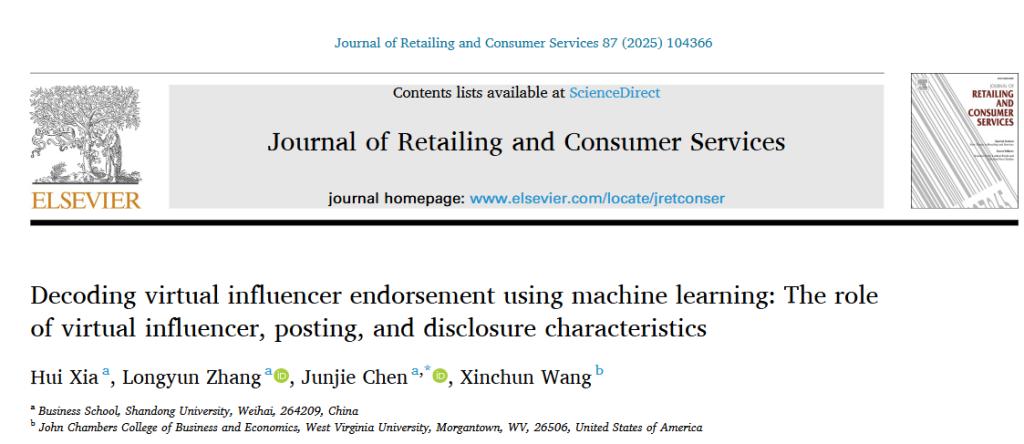 研究成果一:“Decoding virtual influencer endorsement using machine learning: The role of virtual influencer, posting, and disclosure characteristics”发表于SSCI期刊《Journal of Retailing and Consumer Services》(JCR Q1IF=13.1,中科院一区TOP)。yl12311线路检测夏辉教授为第一作者,yl12311线路检测硕士生张龙云为第二作者,yl12311线路检测硕士生陈俊杰为通讯作者,yl12311线路检测为第一和通讯作者单位。该论文是与美国西弗吉尼亚大学王新春教授合作发表。