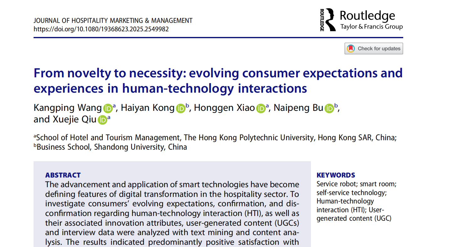 “From novelty to necessity: evolving consumer expectations and experiences in human-technology interactions” 发表于SSCI期刊《Journal of Hospitality Marketing & ManagementIF=11JCR Q1,中科院1top香港理工大学酒店与旅游管理学院博士后王康萍为第一作者,孔海燕教授为通讯作者,yl12311线路检测为通讯作者单位。该论文与yl12311线路检测布乃鹏副教授,香港理工大学肖洪根教授、邱雪洁博士后合作发表。