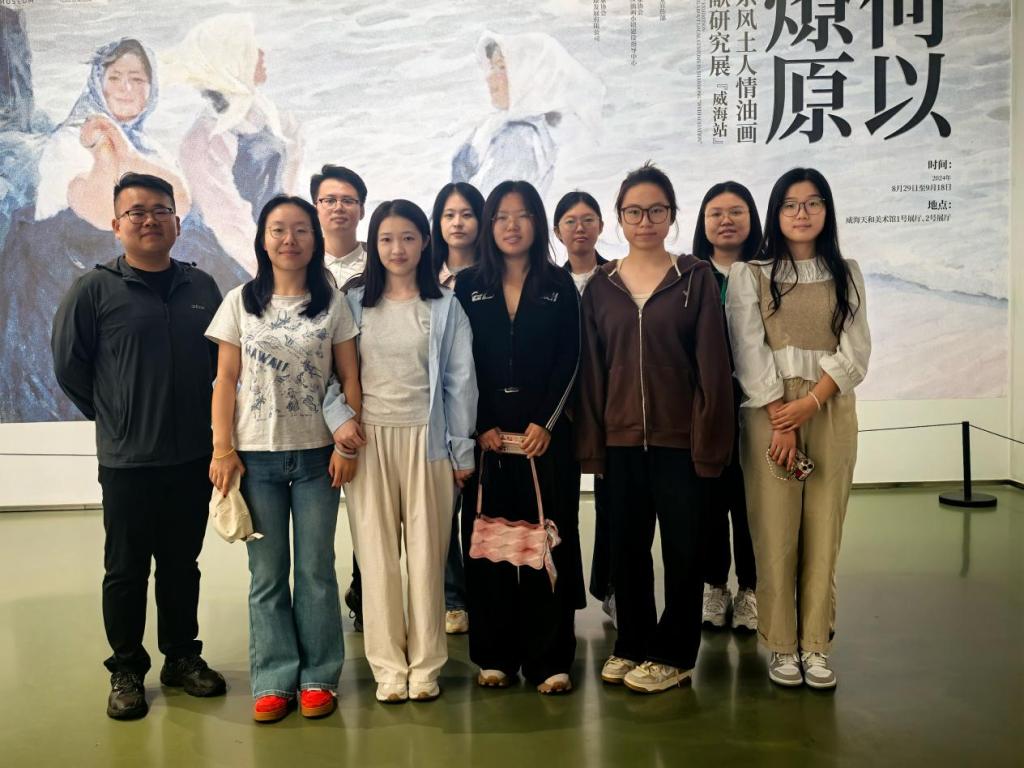 随后,支部成员前往威海天和美术馆,参观了“何以燎原——‘山东风土人情油画’文献研究展”。展览展示了从20世纪80年代至今四十余年间山东油画的发展脉络,参展作品生动地描绘了山东地区的乡土生活和社会变迁,反映了艺术家们扎根生活、关注现实的艺术理念。在参观过程中,支部成员与美术馆工作人员进行了深入交流,了解了油画创作的过程和技巧,以及艺术在文化交流中的重要作用。支部成员苏浩文表示,要将这份对美的追求和对生活的热爱融入到日常工作中,以更加饱满的热情和更加坚定的信念投身到党的事业中去。