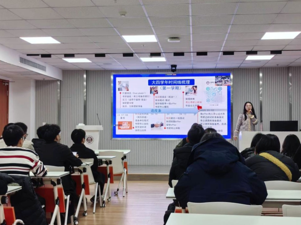 辅导员老师们通过清晰的讲解,为同学们详细梳理了毕业生2025年重要时间节点,引导考研结束的学生及时思考下一步行动规划,积极投身春季校园招聘的浪潮中,做好“两手准备”。辅导员姜文立从简历撰写“小贴士”、春招流程“全分解”、签约流程“一点通”和毕业论文“指南通”等方面对“毕业生任务时间轴”进行了系统梳理。同时,介绍了2025届本科毕业生“就业赋能训练营”的相关安排,鼓励同学们积极参与“就业赋能训练营”的相关活动,关注就业信息。“训练营”将通过简历撰写指导、模拟面试、分享企业招聘资讯、发布求职笔面试经验贴以及线上宣讲会信息等途径,帮助毕业生们提升就业竞争力、胜任力。
