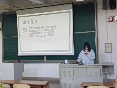 随后的期末动员大会上,学习委员对期末考试安排进行详细介绍,并分享高效复习方法与考试技巧,建议同学们制定合理的复习计划、做到劳逸结合,高效利用学习资源进行学科的交叉复习。对于同学们普遍认为较难的高数科目,学习委员建议同学们关注课后习题,及时巩固复习。并且鼓励同学们以积极乐观的心态备考,正视大学的期末考试。最后在总结中强调,期末考试是对本学期学习成果的检验,希望团员青年可以在秉持诚信考试原则下,发挥团结互助精神,共同进步。团支书鼓励大家将团课所学成果转化为实际行动,在期末复习中展现青年团员的拼搏与榜样力量。