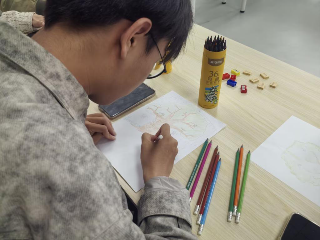 活动开场以绘制“动物自画像”方式增加了同学们之间的认识与熟悉,拉近了彼此之间的距离。在”树木画“环节,伴着一段舒缓的音乐,李静引导同学们进行冥想,想象自己是一棵树,并让同学们在纸上描绘出来,形成我的“树木画”;随后在小组内和大组间进行作品分享,交流大家在绘画过程中的感受。李静肯定了同学们作品的独特性,和其间突显出来的向上成长的力量,也强调了绘画艺术表达方式在心理活动中的疗愈功能,希望大家通过这种方式增进自我觉察,实现个人成长。