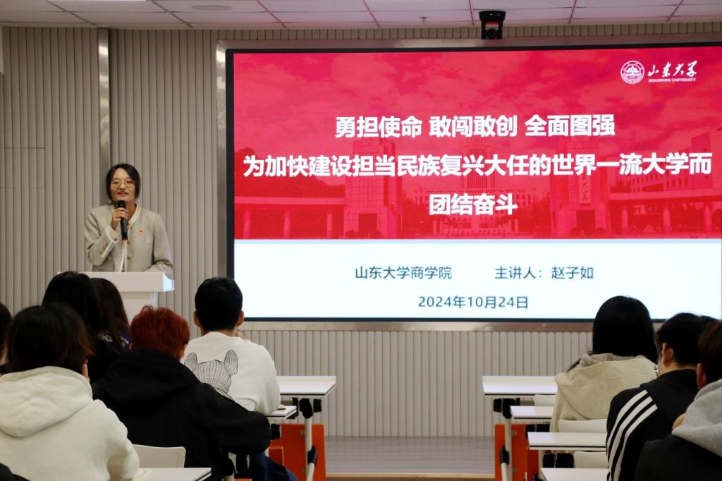 宣讲中,赵子如结合自身参会经历,从参会人员、会议成果、重大意义、会议主题四个方面,详细介绍了学校第十五次党代会胜利召开的具体情况;大会从人才培养能力显著提升、队伍建设奋起勃发等十个角度,全面回顾了第十四次党代会以来的主要工作成绩;围绕新时代新征程学校的历史方位、使命愿景和战略思路三个关键问题,描绘出一幅清晰的山大发展蓝图。最后,赵子如结合个人学习感悟,分享了她对以构筑学在山大、快乐成长的特色育人体系,建设海纳百川、群星璀璨的人才集聚高地等为核心的学校全面图强“九大任务”及其具体要求的理解。通过学习,参会学生骨干深刻认识到要时刻牢记党的嘱托,更加紧密地团结在以习近平同志为核心的党中央周围,高举习近平新时代中国特色社会主义思想伟大旗帜,勇担使命,敢闯敢创,全面图强,将个人成长发展融入学校“一五七九”发展思路,奋力书写为中国式现代化挺膺担当的青春篇章。