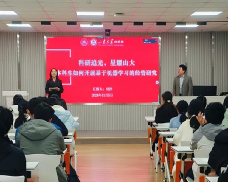 刘锋首先阐述了科研的基本概念和重要性。他认为,科研是探索未知、解决现实问题的过程,对于培养创新思维和批判性思维至关重要。在经管领域,随着大数据时代的到来,机器学习已经成为一种重要的研究工具。他结合个人指导的星耀科研小组的经历,为同学们展示了供应链管理和人工智能交叉融合的研究过程,重点阐释了如何将大数据研究方法应用于经管类选题。他谈到,在选题时,应充分考虑机器学习在经管研究中的应用潜力,紧跟神经网络、强化学习、迁移学习等学术前沿和热点问题,结合自己的兴趣和专长进行综合考虑,深入挖掘机器学习技术在经管领域的应用场景和实例。针对论文撰写,刘锋从如何提炼观点、如何组织论据、如何润色语言等方面分享了个人在撰写论文过程中的一些心得体会。在讲座后,现场同学们踊跃提问,就传统的实证分析方法和大数据方法的交叉融合积极和老师进行互动交流。刘锋鼓励同学们勇于尝试、敢于创新,在科研道路上不断追求卓越。