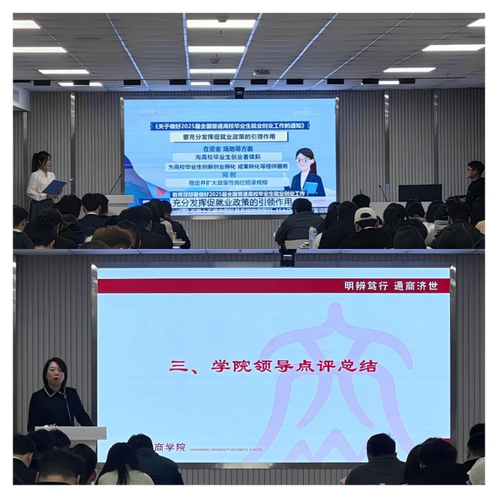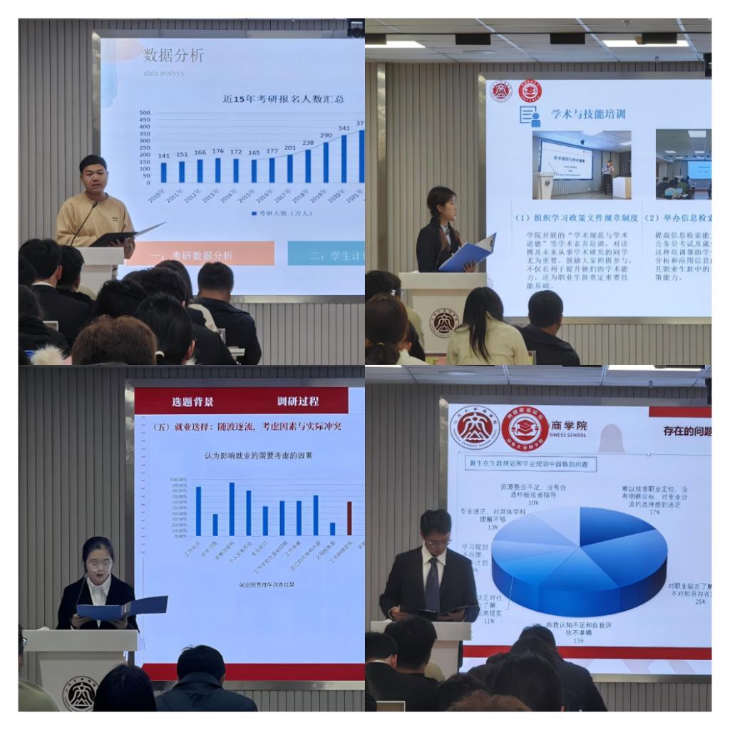 会上,参会人员共同学习2025届全国普通高校毕业生就业创业工作会议精神,深入了解了当前就业创业工作的最新要求和发展方向。在研讨环节,各年级从班团工作出发,围绕职业生涯规划指导工作,依次进行研讨成果分享汇报:2024级本科生以新生的职业生涯规划和学业规划为核心,提出通过职业规划活动增强班级凝聚力和提高班级成员素质的观点;2023级本科生通过专业分流后学生职业规划和就业的认知情况的分析,探讨通过班级文化建设实现个人和班级共同发展的方案;2022级本科生聚焦于大三年级学生的就业认知情况,提出通过了解班级成员真实需求来形成各班特色的职业规划发展的举措;研究生同学分析了当下就业市场的研究生就业竞争态势和结构性矛盾,并提出依据专业特点和行业趋势定制职业规划蓝图的针对性措施。