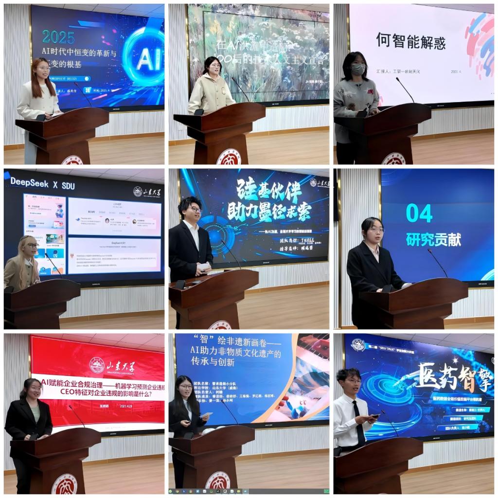 本次比赛吸引众多学生踊跃报名,经初步筛选,最终九个参赛团队及个人参与现场答辩。在AI认知科普赛道,四位选手分享了AI技术的革新与不变、技术人文主义的内涵以及在AI时代守护人性价值的思考,展现了青年学子对人工智能时代的深刻洞察与积极探索。在AI探索赛道,“Deepseek赋能职场”主题,选手展现了AI在职场中的高效应用;“AI赋能学业”主题,选手分享了自己在学习、科研方面使用AI的心得体会。在AI项目实践赛道,各位选手从企业管理、医疗健康、非遗传承、社交生态等主题入手,深入剖析了AI技术如何赋能创新实践。