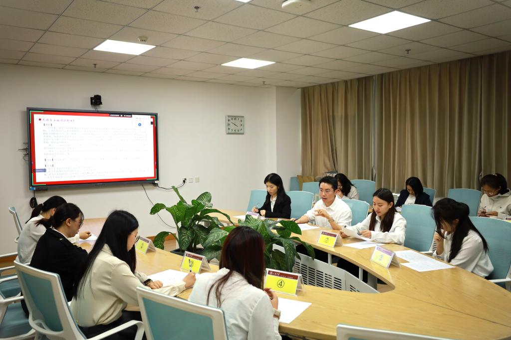 在无领导小组面试环节,参赛选手根据面试题目依次完成材料阅读、阐述个人观点和自由讨论等流程,最终达成共识并推选1人进行总结陈述。这一比赛环节,选手们的团队协作能力、语言表达能力与综合分析能力得到了充分展现。比赛结束后,四位评委老师复盘了无领导小组讨论的团队表现情况,并对每位参赛选手的表现进行针对性点评并提出了许多合理建议。